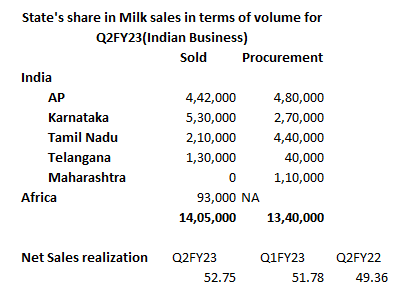 The company has only 5% Buffalo, the balance 95% is cows and 40% of sales quantity is coming from Karnataka which is predominantly in the cow’s milk sales. Hence, the net realization is 52.75