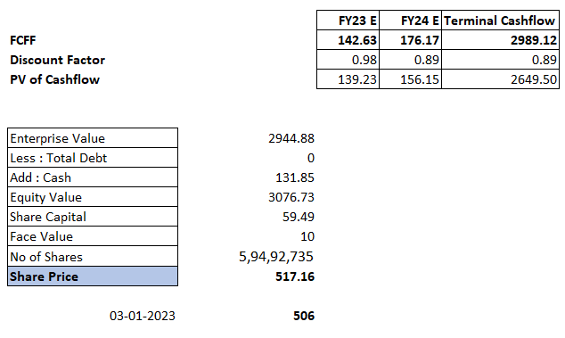 I have projected for two years and discounted FCFF to get fair value. for the rest of the assumption, refer to model provided at the end of this article